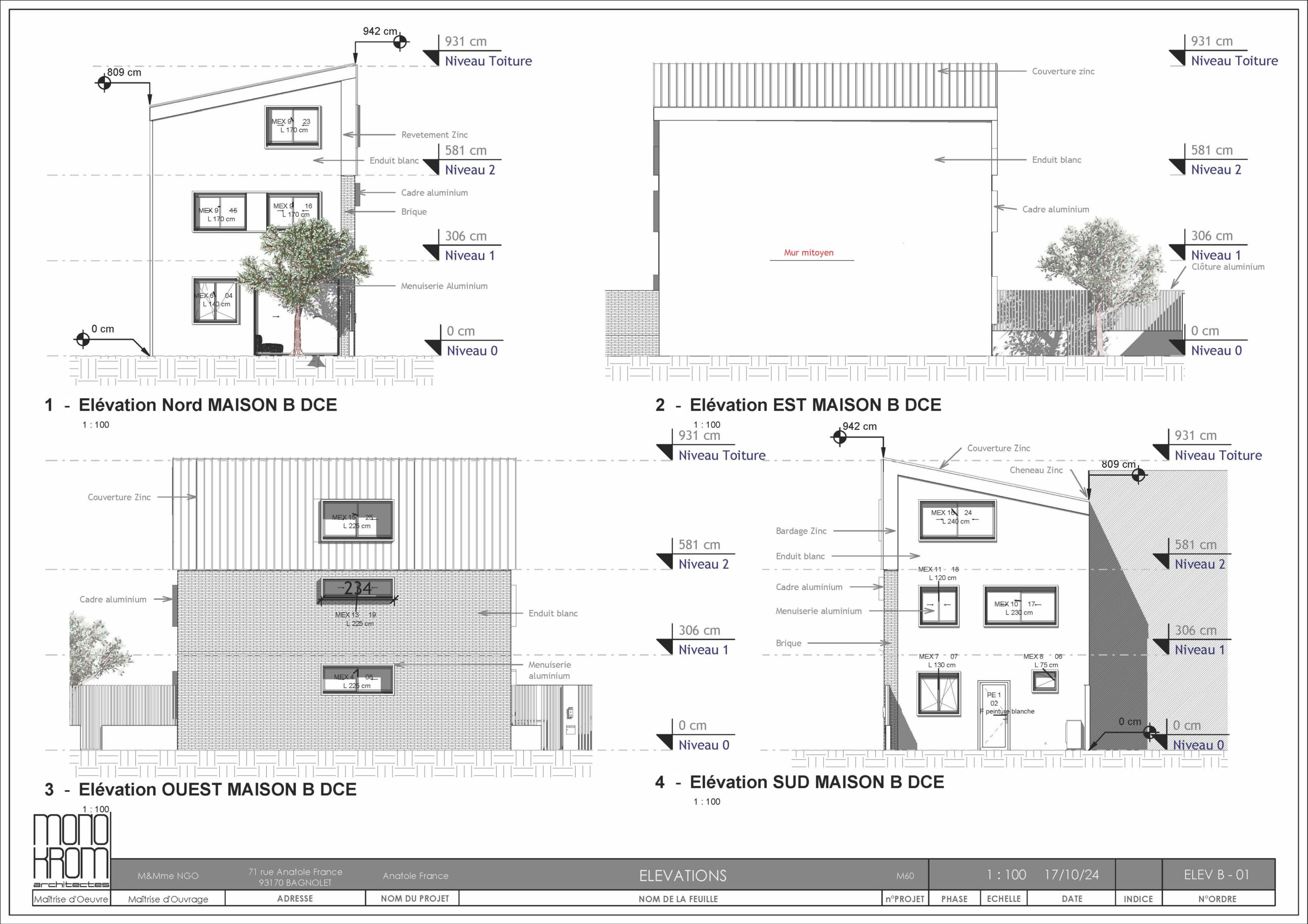 Le projet consiste à construire 2 maisons individuelles en R+1 + combles et de composer la toiture de manière à ce qu’elle s’intègre au mieux avec les avoisinants. Les toitures à un seul pan font référence aux maisons existantes dans une expression contemporaine en zinc. Les 2 toitures des maisons se croisent pour créer un rythme urbain dynamique. Le croisement des toitures permet que la maison située sur la 2e parcelle bénéficie d’un apport de lumières important tout au long de la journée.