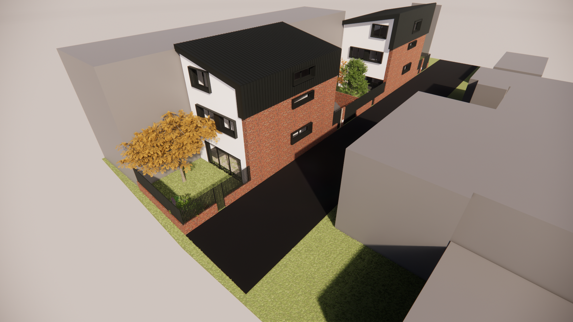 Les 2 maisons sont de représentation architecturale similaires : Forme rectangulaire simple s’inscrivant sur la longueur des 2 parcelles entourées de 2 jardins d’agrément avec une place de parking couverte chacune.